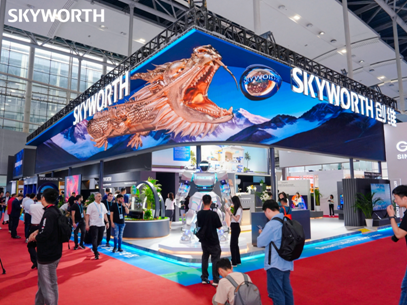 创维展台位于A区3.2号馆。500多平方米的展台顶部大屏幕上,裸眼3D特效中的金龙追着创维“SKYWORTH”logo金球,左右翻腾,视觉效果十分震撼。3D金龙下方,一个2米多高的光伏3D机器人造型酷炫,吸引来往的各国客商纷纷驻足,打卡拍照。部分客商被震撼的视觉吸引,分批进到创维展台,继续探寻前沿的科技生产力。