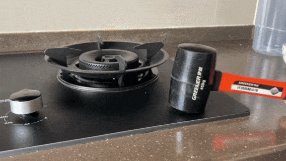 灶具AB58号称“防爆灶”,当面对榔头这等“暴力攻击”时,它的抗冲击能力到底如何?将榔头对灶具角落进行连续敲击,从试探性的轻敲到越来越用力的重击,连炉头都跟着剧烈晃动,面板却始终完好无损,没有一丝裂痕。