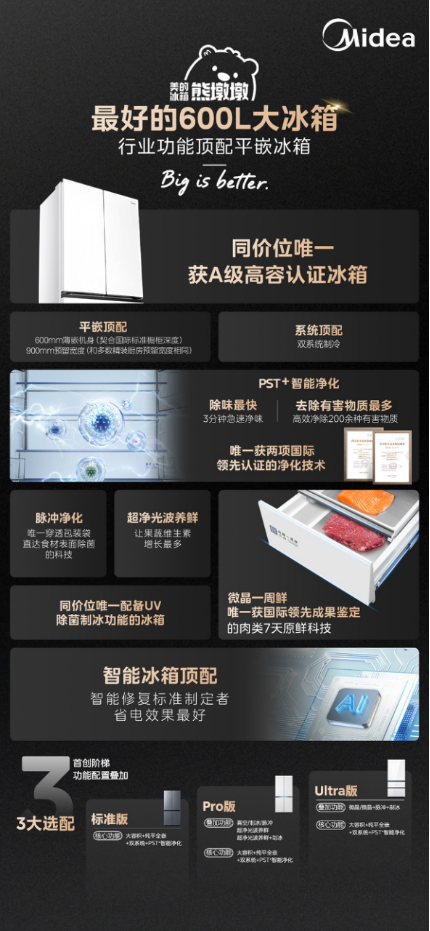 1、作为行业唯一获A级高容认证的系列,美的熊墩墩系列用500L占地实现600L+容量,让“小户型也能拥有大冰箱”成为现实;