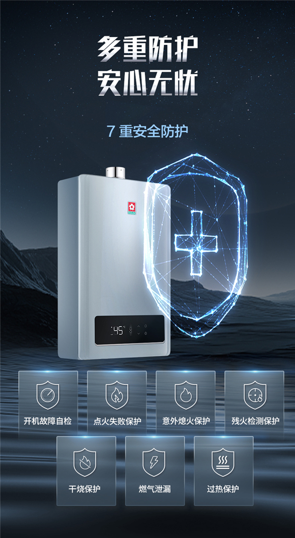 家庭用水场景越频繁,安全保障越关键。樱花燃气热水器的七重防护体系,在多场景使用中时刻在线:开机自检确保每次启动,无论清晨洗漱还是深夜厨房用水,都处于安全状态;点火失败保护避免厨房频繁开关水导致的点火异常;干烧保护防止忘记关水龙头后的隐患;漏电保护则在洗漱、厨房等潮湿环境中额外添一份安心。