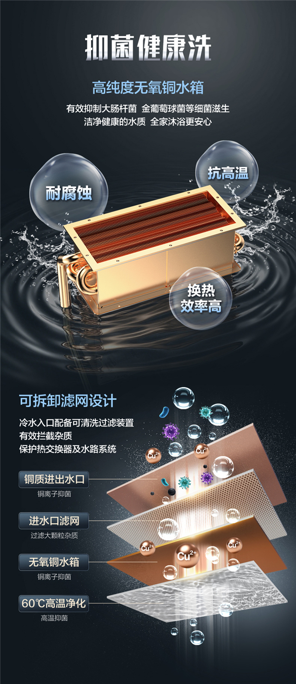 更值得关注的是其多重抑菌闭环,铜质进出水口通过铜离子持续抑菌,60℃高温净化功能可二次杀灭残留细菌,三者协同让每一次肌肤接触都温和无刺激,尤其适合婴幼儿、老人等敏感人群。