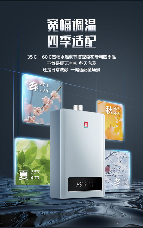 35℃-60℃的宽温域搭配樱花专利四季温模式,让操作化繁为简。春季40-42℃、夏季38-40℃、秋季42-44℃、冬季45-46℃,一键即可匹配季节需求,老人小孩也能轻松驾驭。