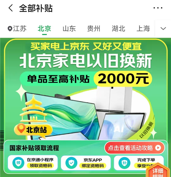 2、抢购地区:北京、江苏、重庆、安徽等。江苏每日10:00发放家电/数码券,甚至限定当天使用;安徽采取采用摇号模式,周一二报名、周三至周五摇号、周末查结果,未中签可参与企业补贴。