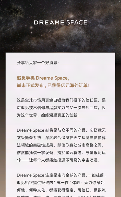 追觅科技正用其行动证明:中国科技企业不仅能够做好商业模式创新,更能够攻克硬核技术,参与人类最前沿的探索事业。Dreame Space手机的推出,将天文摄影带给普通消费者,让科技真正服务于人类对未知的好奇与探索,体现了科技与人文的完美结合。