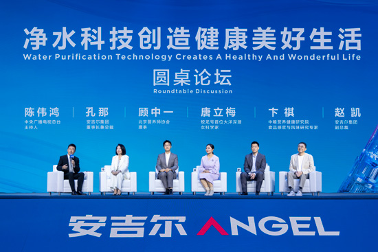 发布会上的圆桌论坛环节,安吉尔集团董事长兼总裁孔那、副总裁赵凯与营养师顾中一、科学家唐立梅、中粮食品感官与风味研究专家卞祺和主持人陈伟鸿围绕“净水科技创造健康美好生活”展开深度对谈。