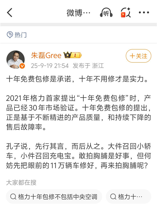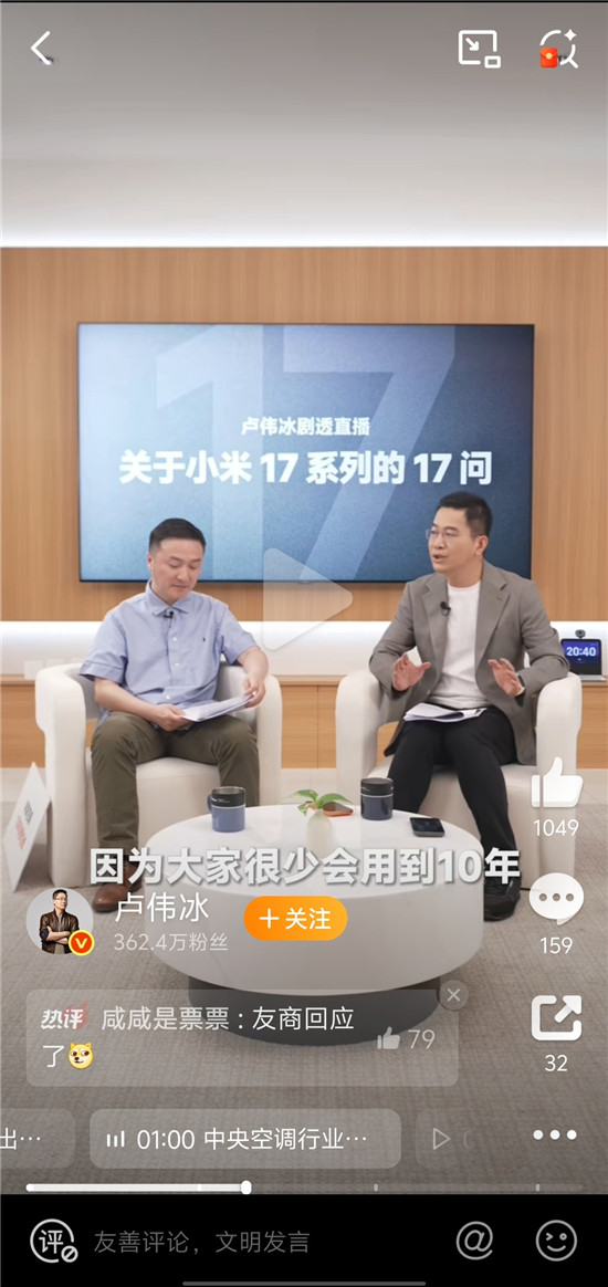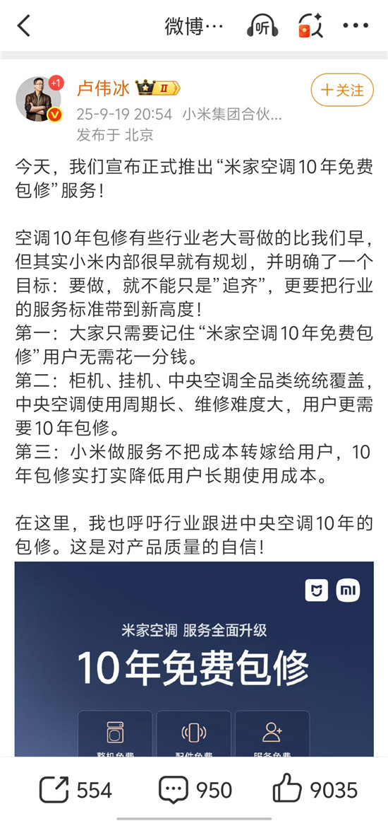 可能正是基于8月份的这场口舌之争,在9月19日,卢伟冰在直播中宣布:小米空调正式推出十年免费包修服务。
