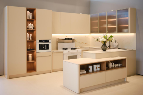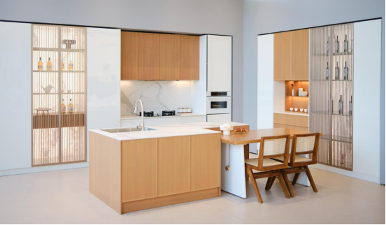 博洛尼橱柜主营整体厨房、全屋定制及卫浴、内门等家居产品。整体以现代简约风格为主,注重空间线条设计与自然材质运用,强调功能性与美学平衡。