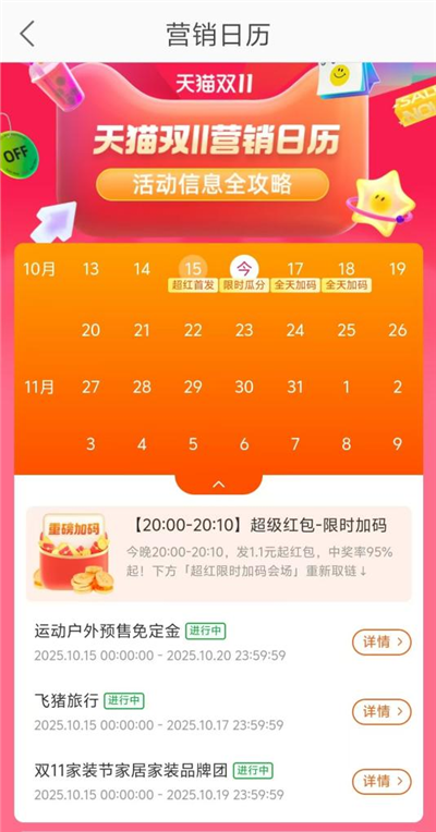 从2012年起,双11活动时间开始向前拉长;2020年,天猫进一步调整活动节奏,首次将会场分为上下两场:第一场从10月21日开启预售、11月1-3日支付尾款,第二场覆盖11月4日至11日,通过“分阶段释放需求”优化体验。与此同时,其他平台也积极跟进,在日益激烈的竞争氛围中,双11的启动时间被不断提前,到2024年,核心平台的双11预售已提前至10月14日的晚8点。