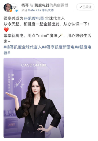 “杨幂身上的韧性,对生活品质的追求与审美表达,与凯度电器‘以科技提升生活质感’的品牌理念高度契合。”谈及此次代言合作时,凯度电器CEO柯漫表示。