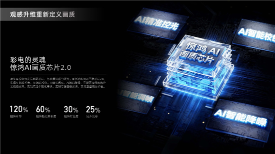 一是惊鸿AI画质芯片2.0,堪称画质优化的“智慧大脑”。作为画质提升的核心引擎,惊鸿AI画质芯片2.0具备四大核心能力:AI精准控光、AI智能校色、AI智能调帧、AI智能降噪。它不仅能呈现更高倍数的分区视觉效果,还可根据用户偏好定制专属图像,实时优化观赏体验。比如老人偏爱更柔和的亮度、孩子观看时自动开启护眼色彩模式、年轻人追综艺时强化色彩饱和度,真正实现“千人千面”的专属画质。经实测,该芯片可实现细节提升120%、控光精细度提升60%、对比度提升30%、光晕减少25%,让画质优势量化可见。