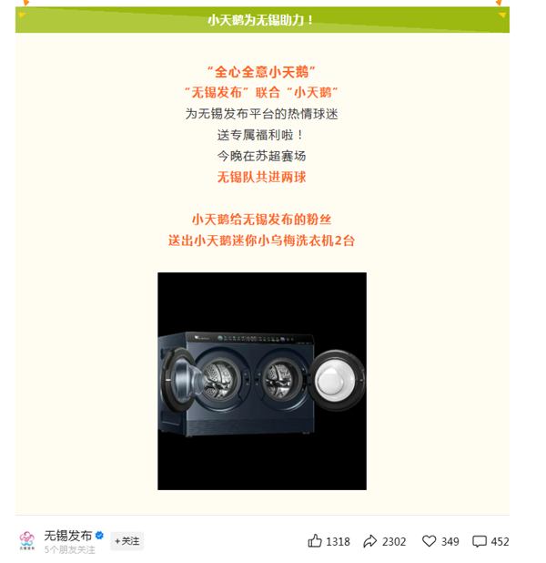 在众多参与品牌中,小天鹅作为无锡本土成长起来的品牌,主动将无锡队认领为自己的“主队”,携手“无锡发布”为球迷送出迷你洗衣机。在第五轮比赛中,还推出“常州队每进一球,就抽奖送哆啦A梦联名款迷你洗衣机”的活动,成功激发了本地球迷的热情。“品牌+本土球队+球迷福利”的营销模式,既增强了地域认同感,又让产品成为传递情感的媒介,达到了“可视化、可感知、可体验”的营销成效。小米同样以“品牌+福利”作为营销切入点,成为苏超官方供应商后,通过抽奖形式向观众赠送小米手环,契合了赛事所倡导的健康理念。