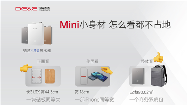 德意通过全新技术优化内部结构,将水路、风路与火路高效整合,使整机尺寸仅为443×313×160mm,占地仅0.02m³,体积缩小高达38%。从正面看,它与一块砧板同大;从侧面看,仅有一部手机的宽度;整体则如同一个商务双肩包般轻巧。更小巧身材、更精致的设计,让热水器不再与空间“抢地盘”,用户可随心自由布局,轻松适配装修需求,兼顾收纳美感与操作便捷。