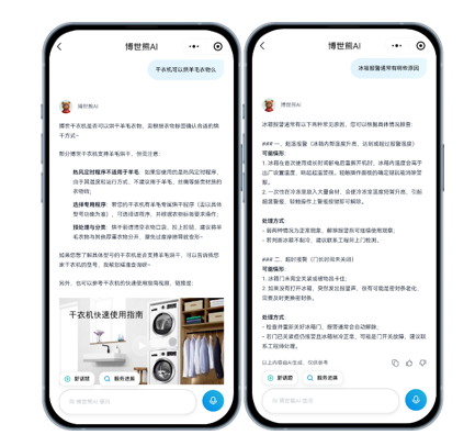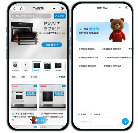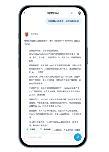 家电产品的“使用旅程”长达数年甚至十余年,期间的疑问、调试与维护需求虽琐碎,却直接影响着体验与产品的生命周期价值。传统依靠说明书、断续性在线搜索或周期性客服支持的方式,往往存在信息碎片化、不及时的痛点。“博世熊”作为一部实时更新、交互智能的“家电百科全书”,将专业支持无缝嵌入日常使用场景。无论是操作疑惑(如“微蒸烤一体机的组合烹饪模式如何设置”)、功能探询(如“沸石烘干技术的核心优势是什么”)、保养咨询(如“洗碗机滤网多久清洗一次”),还是故障预警(如“洗衣机显示E32代码应如何初步排查”),“博世熊”都能提供即问即答、步骤清晰的指导。