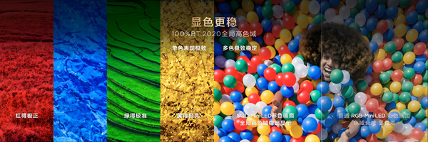传统RGB-Mini LED显示多色画面时需三色灯珠组合发光,导致色域值下降,同时RGB-Mini LED相邻分区不同色光易逸散串扰,而TCL Q10M Pro背光均为纯净白光,画面边缘锐利清晰,色彩纯净度大幅提升。与RGB-Mini LED的局部高色域不同,TCL Q10M Pro的全局高色域不挑画面,更没有串色问题。显示单色画面时,红得极正、蓝得极透、绿得极准、黄得极亮,每一种色彩都精准还原;显示多色复杂画面时,由于发光方式始终一致,色域值不会出现波动,色彩依旧纯净准确。