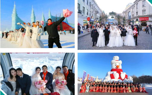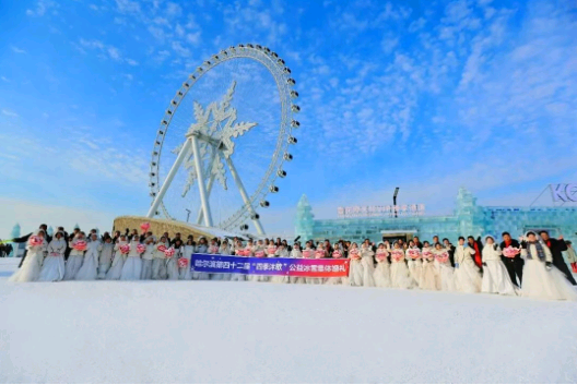 一场专属冰雪浪漫之旅徐徐展开。新人们乘坐120米高的大雪花摩天轮,登高俯瞰银装素裹的北国风光,将冰城美景尽收眼底;在太阳岛雪博会,他们驻足于憨态可掬的“雪人先生”、气势磅礴的主塑“雪艳春”等雪雕作品前拍照留念,沉浸式体验“走着走着就一起白头”的人工降雪浪漫场景;在百年中央大街,他们手捧喜糖,与来自全球的游客分享新婚喜悦,让幸福气息弥漫在街头巷尾,成为冬日里最动人的风景。