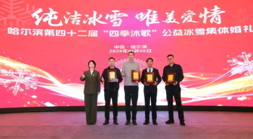 凭借在本届公益冰雪婚礼中的突出贡献与责任担当,四季沐歌集团再度荣获“特殊贡献单位”称号,这一荣誉既是对四季沐歌践行社会责任的高度认可,也是企业以公益力量助力冰雪文化传播、彰显企业温度的生动见证。共青团哈尔滨市委副书记徐翎为四季沐歌颁奖。