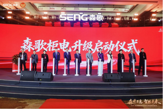 在全场目光的聚焦与倒数声中,范德忠董事长、范佳辰总经理、冠军邵雨琪、公司核心管理层与优秀经销商代表共同启动森歌柜电升级仪式。