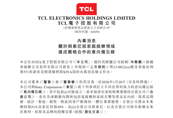 双方预计在2026年3月底前签署最终协议,以敲定合作的各项细节。据索尼官网披露,整合了双方资源与业务的新合资公司,预计将于2027年4月正式开始运营,索尼电视和音响业务,将在一年后进入由TCL主导运营的新发展阶段。
