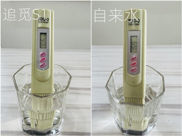 为了更直观地验证追觅S1的过滤成效,首先借助专业的TDS笔进行测试。TDS是“溶解性固体总量”,一般用来衡量水的纯净度,TDS越低证明水中杂质总量越少,用水更健康。