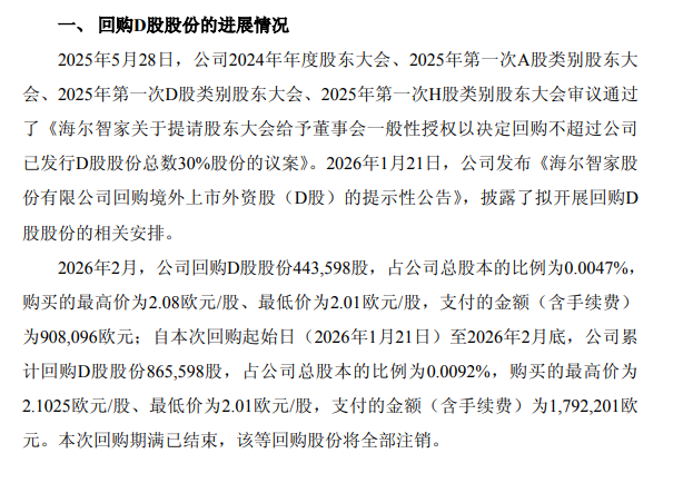 D股方面,自本次回购起始日(2026年1月21日)至2026年2月底,累计回购D股股份865,598股,占公司总股本的比例为0.0092%,购买的最高价为2.1025欧元/股、最低价为2.01欧元/股,支付的金额(含手续费)为1,792,201欧元。本次回购期满已结束,该等回购股份将全部注销。