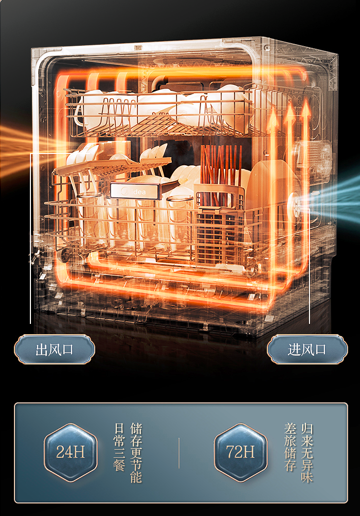 美的飞檐XH10集成洗碗机搭载PTC热风技术,85℃热风循环烘干,洗涤过后能快速烘干内腔,带走餐具上的水汽,开启72小时鲜存模式,让碗碟保持长久干爽清新。