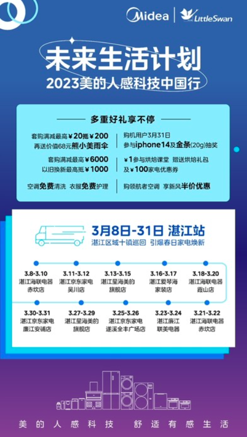 美的深耕中国市场,致力于为万千中国家庭提供理想人居生活,为了让人感科技产品与人居生活解决方案触达各区域、各用户,美的近日开启了人感科技中国行活动,3月8日-3月31日,美的人感科技中国行篷车走进湛江十镇,此次巡展涵盖空调、冰箱、洗烘套装等多种类产品,助力湛江十镇消费者理享人居空间的升级进化。