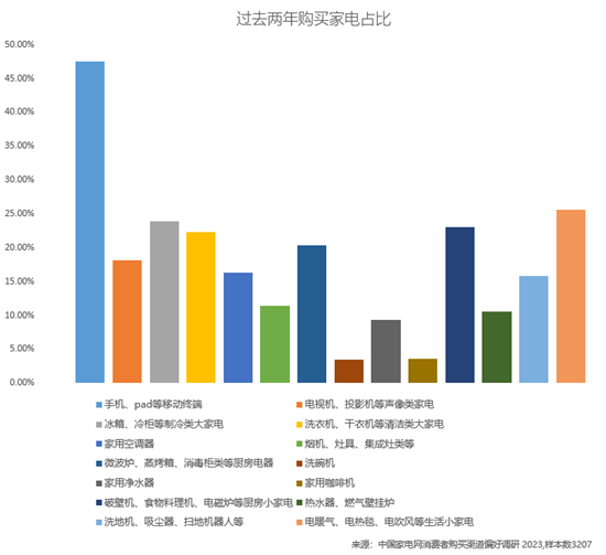 根据此次调研数据,过去两年购买过的家电品类(多选)中,手机、pad等移动终端占比较高,达到47.5%左右。倾向于满足多样化需求的电暖气、电热毯、电吹风等生活小家电以及破壁机、食物料理机、电磁炉等厨房小家电占比分别为25.6%和23%。满足消费者生活上基本需求的冰箱、冷柜等制冷类大家电与洗衣机、干衣机等清洁类大家电占比达到23.9%%和22.30%。
