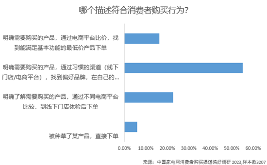 家电消费的另一面,是消费者在消费时已经更趋于理性。网上主动搜索是消费者最为常见的获得相关产品信息的渠道,当消费者存在某种需求或潜在需求时,消费者更积极地寻求折扣和促销,寻找价格更具竞争力的渠道来购买想要的品牌。同时,线上购买平台的搜索排名也会对消费者选择渠道产生影响。除此之外,超一半被调研消费者明确表示,需要购买的家电产品,通过习惯的渠道(线下门店/电商平台),找到偏好品牌,在自己的预算内进行选择,由此可见,相当部分消费者倡导“钱包友好”,更关注确定性的购物需求。