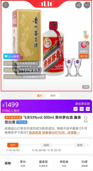现在,登录苏宁易购APP搜索“飞天茅台”参与预约,晚8点1499元准时开抢。