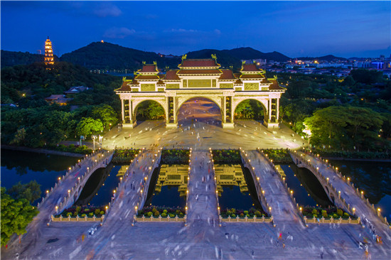 在顺峰山公园北入口,跨过五行桥,便来到了公园标志性建筑——石牌坊。这座享有“中华第一牌坊”美誉的三跨拱结构牌坊,由2万余块岩石镶嵌而成,总高度达37.6米,四个基座上的16条浮龙挂落在石柱上,凌空而下,气势恢宏。