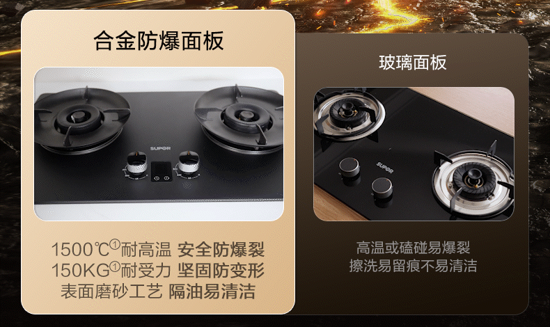 对于燃气灶而言,面板安全是守护厨房的首要且最为关键的防线。传统燃气灶大多采用普通钢化玻璃面板,这种材质存在明显短板,耐高温能力欠佳,极易在外力冲击下发生爆裂,给厨房使用带来极大的安全隐患。苏泊尔多重安全防爆灶MF1pro配备了合金防爆面板,为厨房构筑起了一层坚不可摧的“金钟罩”。