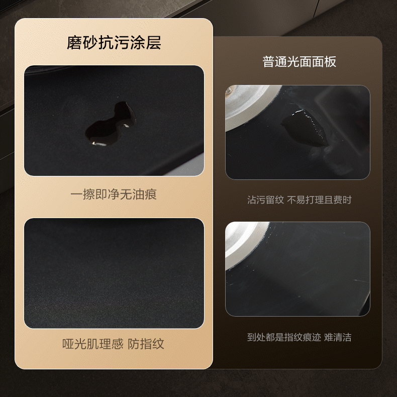 MF1pro的面板经过磨砂工艺处理,形成了疏油疏水的微结构。当指纹、水痕以及油渍不慎落在面板表面时,会自然凝结成细小的水珠,视觉上几乎看不到,不会对面板的美观造成影响。在日常清洁时,仅需使用一块湿抹布轻轻擦拭,面板便能迅速恢复洁净状态,无需借助任何化学清洁剂的辅助。即使是爆炒后留下的重油污也能轻松擦去,大大减轻了家务负担,让厨房不再“油光闪闪”。