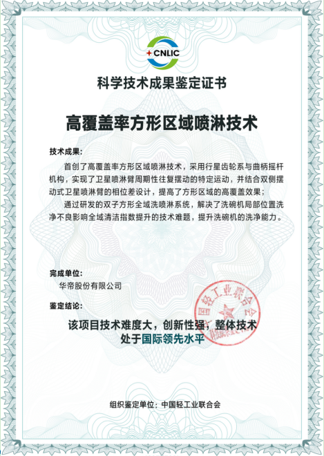中国轻工业联合会出具的《科学技术成果鉴定证书》中明确指出,该项目“技术难度大,创新性强,整体技术处于国际领先水平”,这一评价是对华帝在洗碗机核心技术研发上所付出努力的高度认可,更是中国家电企业实现自主创新突破的有力证明,为后续本土品牌在全球厨电技术竞争中抢占话语权奠定了坚实基础。