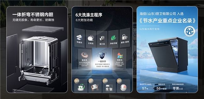 真正的健康,也关乎人与环境的和谐。凭借对节水性能的技术优化,海信厨卫成功入围“山东省节水产业重点企业名录”。作为海信厨卫的明星产品,海信零菌洗碗机大薄荷系列C507iPro通过3D双卫星喷淋臂和四维喷淋系统,实现水流精准覆盖,高效利用每一滴水,真正做到节约用水与洁净生活的“双向奔赴”。