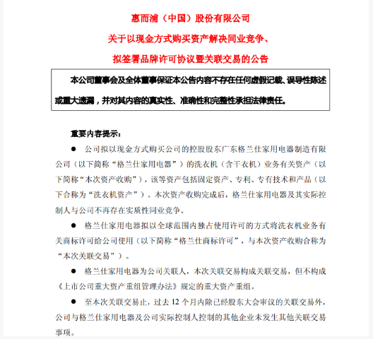 惠而浦7462万元收购格兰仕洗衣机业务资产