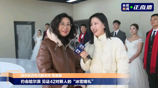 婚礼盛典期间,哈尔滨青年宫副主任李波澜与5对来自天南海北的新人代表受邀走进央视总台冰雪演播室,围绕“纯洁冰雪 唯美爱情”的主题向全国观众分享这场独特婚礼的心动瞬间。