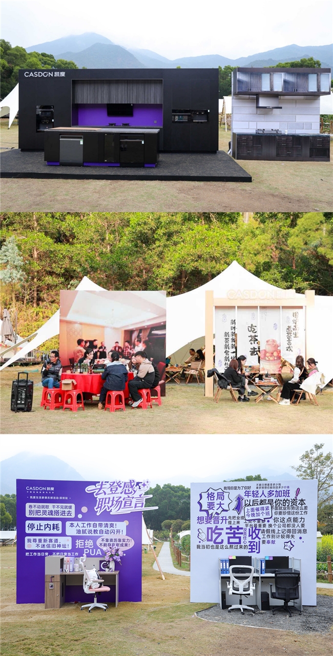 活动现场以三大核心场景层层递进,构建了从“视觉冲击”到“情感共鸣”的完整体验链路。走进反登感·平行时空馆,仿佛踏入一场时空交错的艺术展,生活、职场、社交三大平行宇宙形成强烈的新老对冲:一边是油腻昏暗、手忙脚乱的老厨房,一边是智能清新、解放双手的凯度“幂”式生活美学馆;一边是写满“我骂你是为了你好”“年轻人多加班”的窒息格子间,一边是贴着“停止内耗”“不靠资历靠实力”的杨幂式元气办公桌;一边是喧闹强迫、充斥面子文化的传统酒桌,一边是安静舒适、自在惬意的围炉煮茶小天地。强烈的视觉反差与场景对比,不仅直观解构了“老登感”与“幂式松弛”的代际冲突,更让每一位参与者都能在其中看到自己的影子,引发对自我生活方式的深度审视。