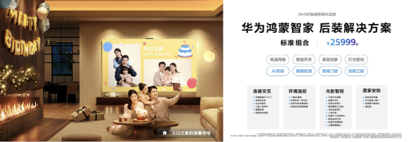 让主动智能体验走进千家万户,离不开丰富的产品矩阵与解决方案。鸿蒙智联生态汇聚合作品牌3200余家,覆盖品类400余种,丰富生态产品在华为智慧生活APP中可查可购,为消费者带来种类丰富、方便购买、物有所值的智能家居产品。针对旧房改造人群需求,华为鸿蒙智家推出了后装解决方案三档套餐,包括9999元尝鲜组合、25999元标准组合、49999元专业组合,覆盖全屋智能基础需求和进阶体验。同时提供智能温控组合、厨房安全组合、智能窗帘组合等局部入门套装,百元级价格即可实现局部改造,大幅降低体验门槛,让智能生活从一个场景轻松开启。