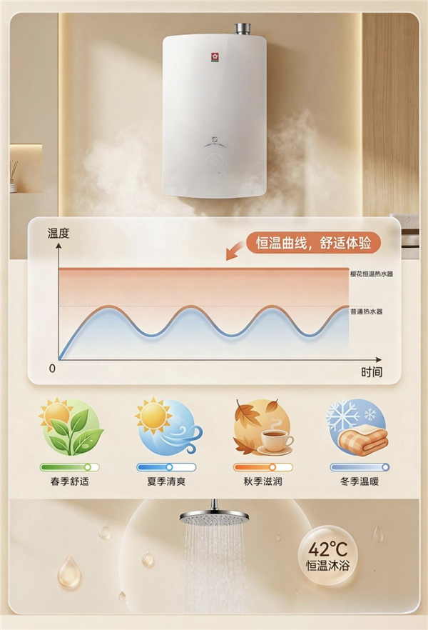 舒适生活的关键,在于水温的精准掌控。樱花燃气热水器E611A采用PID智能恒温系统,能够实时感知水流与温度变化,自动调节燃气和风机输出,将最低温升控制在≤5K,用户只需一键设定,即可享受理想温度,无需频繁调节,洗浴体验更轻松自在。四季皆宜的设计,让春季用水更温润,夏季不烫肤,秋季更滋润,冬季不骤冷,让每一次接触热水都能享受恰到好处的暖心陪伴。