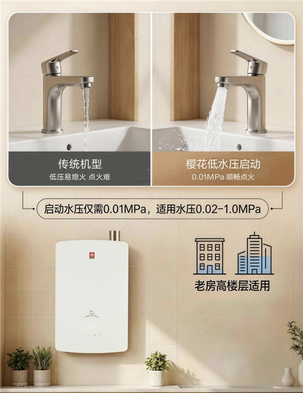 在水压不足的环境下,常常会遇到热水器无法顺利启动,出现出水慢、点火难的困扰。樱花燃气热水器E611A采用0.01MPa超低水压启动技术,即便在极低水压下也能顺畅点火,稳定澎湃的热水流量,无论是老房改造还是高楼层家庭,都能轻松使用,告别涓涓细流的无奈,畅快感受从容自在的热水体验,极大提升生活便利性。