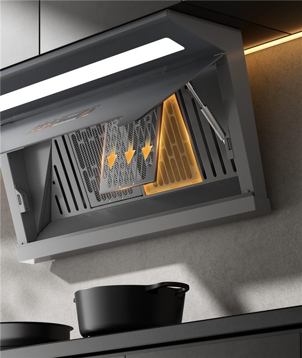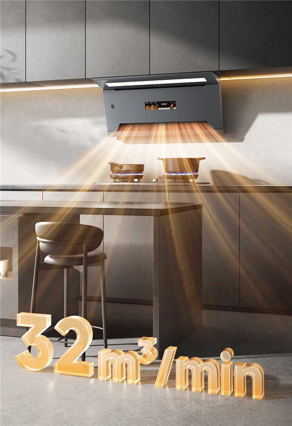 樱花吸油烟机Q801以32m³/min大风量配合1200Pa强劲静压,在油烟刚刚升起的瞬间,即完成高效锁定,并快速排出。无论是辣椒爆炒还是重油烹饪,油烟尚未扩散,便已被及时吸入并排出。顶侧双吸结构进一步压缩油烟上升与扩散空间,实现立体捕捉,确保油烟、热气不扑面、不外溢,让空间始终保持净爽清透。