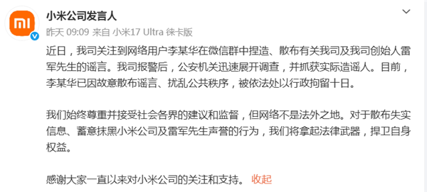 近日,小米公司针对网络用户李某华在微信群中捏造、散布有关该公司及其创始人雷军先生的谣言一事,采取了法律行动。小米公司发言人4月26日对外宣布,在该公司报警后,公安机关迅速介入调查,并已抓获实际造谣人李某华。目前,李某华因故意散布谣言、扰乱公共秩序,已被依法处以行政拘留十日的处罚。