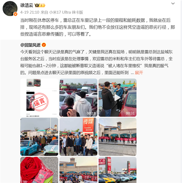 此前,针对“雷军被堵车里维权”的传闻,小米集团董事长特别助理、战略市场部副总经理徐洁云曾于4月19日公开回应,澄清事实。他表示,当时雷军只是在服务区停车后,在车内记录上一段路程的里程和能耗数据,现场有许多车友和粉丝,并非所谓的“维权”场景。徐洁云当时亦表示,绝不会放任此类凭空造谣的恶劣行径。